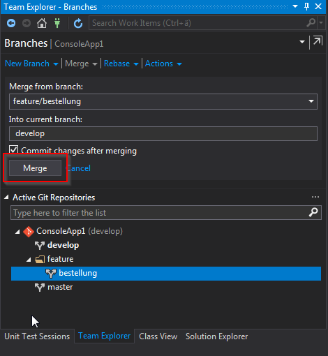 * Mergen Sie das Feature in den develop Branch und löschen Sie den feature Branch